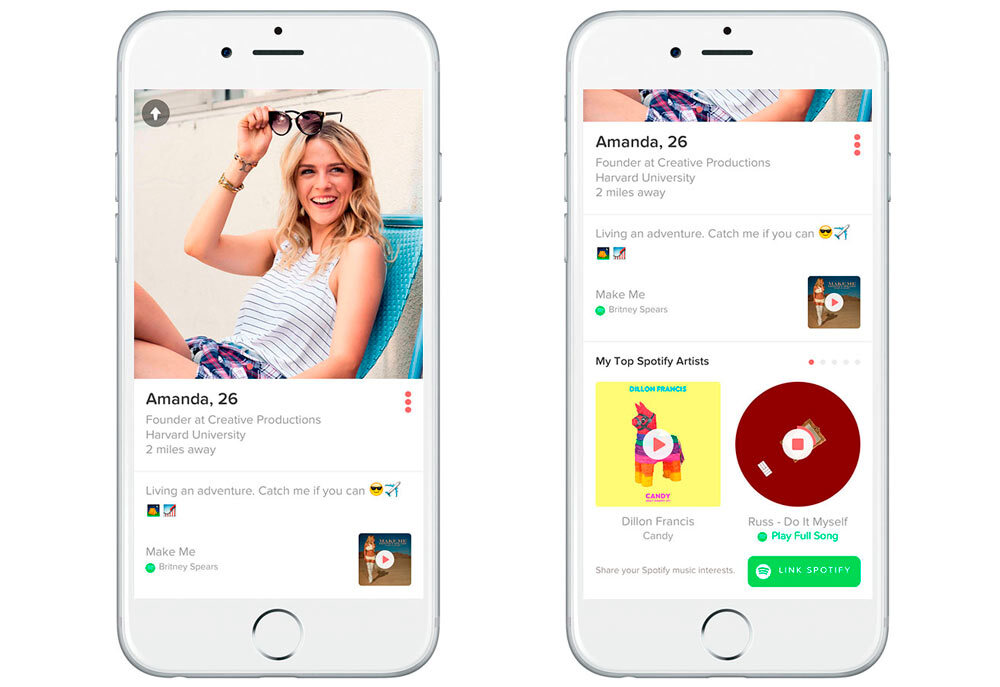 Una vez conectadas, la música elegida aparecerá en los perfiles como un gusto más. Si el usuario que busca candidatos/as no tiene Spotify, podrá escuchar una muestra de la música antes de arrastrar la foto a la derecha o a la izquierda (o enviar un Super Like arrastrando hacia arriba). En el caso de que sí posea cuenta en Spotify, escuchar las canciones será cuestión de un par de clicks.