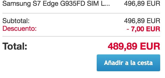 Este Samsung Galaxy S7 Edge posee un precio de 496,89 euros. Aunque, como digo, el vendedor ofrece 7 euros de descuento; por lo que el móvil se queda en 489,89 euros. Como para pensárselo.