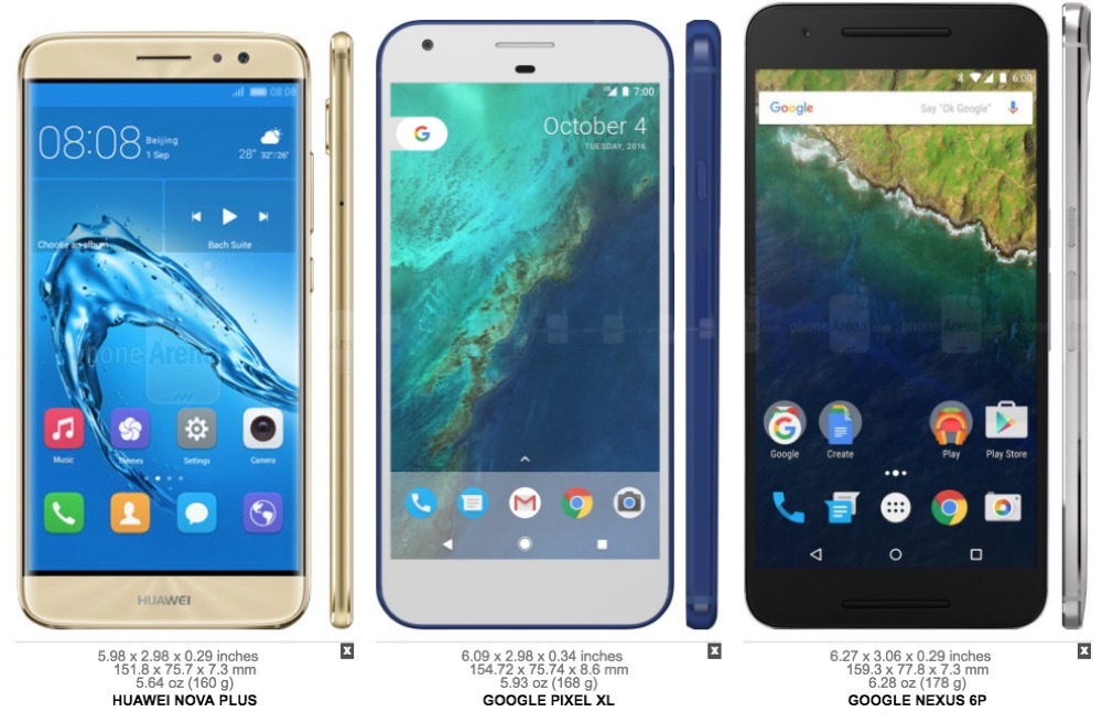El Google Pixel estaría inspirado en el Huawei Nova y el Google Pixel XL en el Nova Plus. Los dos móviles guardan una línea de diseño similar a la del Nexus 6P, mejoran el tamaño, el sensor de huellas y la cámara aunque es de esperar que con Google detrás habrían mejorado todavía más el resultado final. La cámara del Pixel incorpora un sensor IMX379 que en los Nova no está. También se ha añadido un Snapdragon 821 cuando en los Nova se utiliza un procesador muy inferior, lo que repercute en el precio.