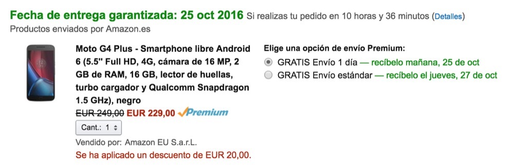 El Moto G4 Plus es la versión más potente de los Moto G. Su precio inicial se acercaba más a los trescientos euros pero ha ido bajando poco a poco y ya tiene un precio muy suculento. El precio estándar es de 249€ pero se le aplicará veinte euros de descuento al final del proceso de compra por lo que se queda en 229€, un precio muy por debajo de su competencia si no tenemos en cuenta a los móviles chinos.