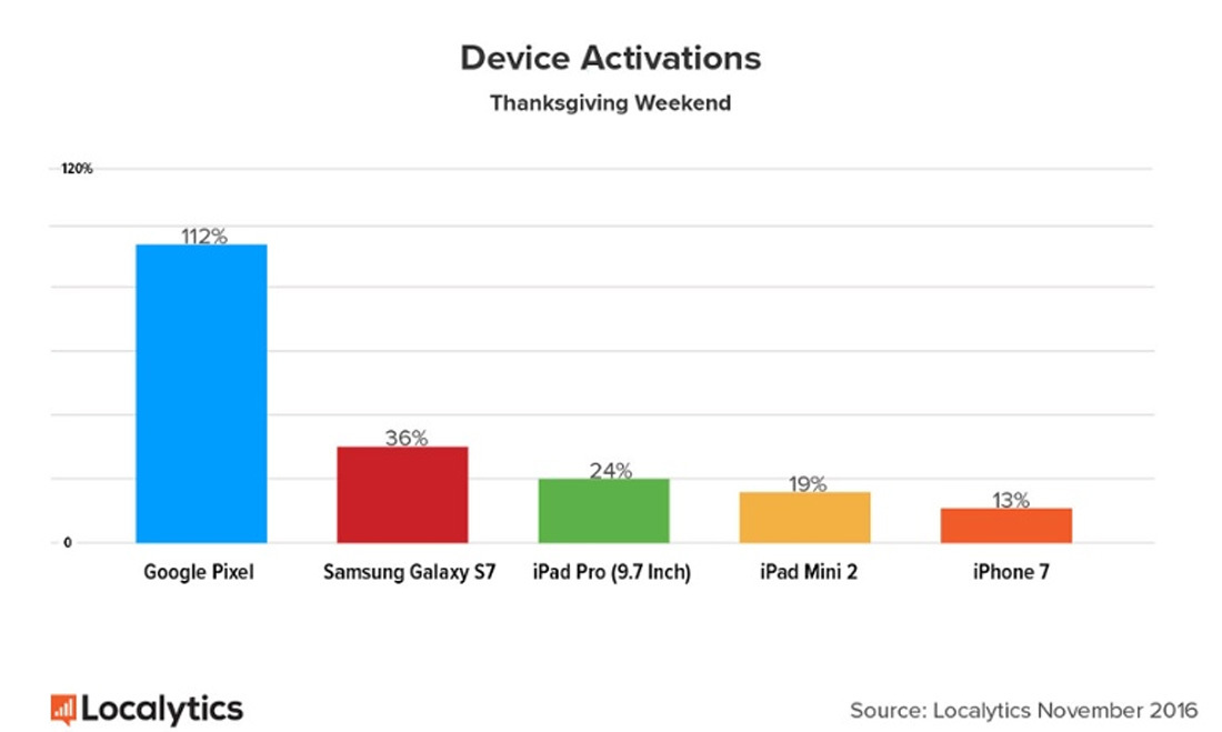 Por cada Pixel activado una semana antes de la festividad estadounidense en los días analizados se han vendido más de dos. Sin embargo el incremento no ha sido tan sustancial en otras modelos como el Samsung Galaxy S7 o el iPhone 7.