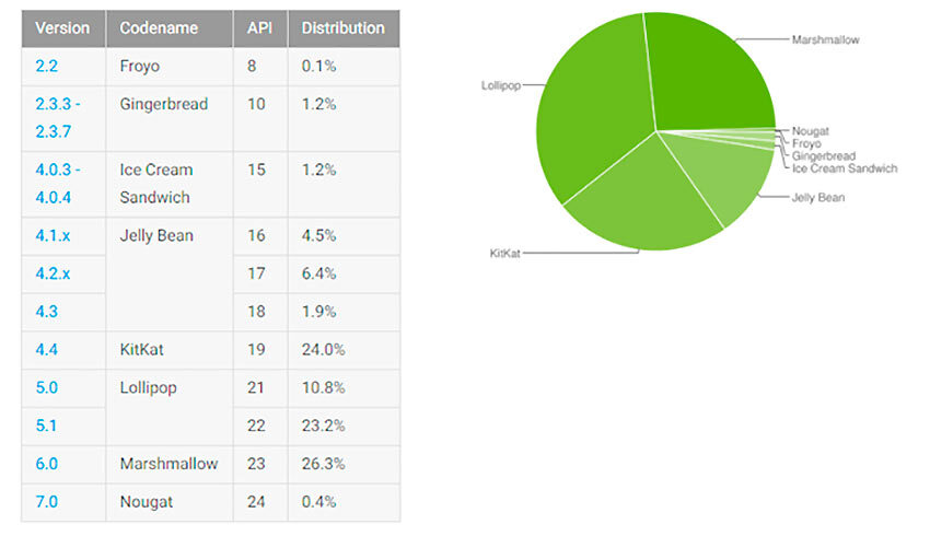 Un síntoma de que las versiones más atrasadas van más o menos subiendo de nivel es el hecho de tener 2 puntos por encima a Marshmallow: del 24, al 26,3 %. No es mucho, pero sí un indicio de que, al menos, el parque de móviles adopta una de las versiones más avanzadas y estables.