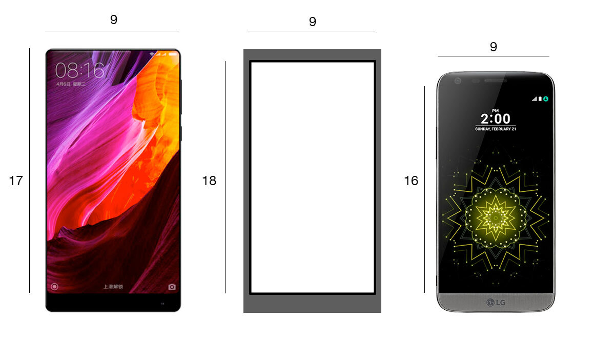 Uno de estos es el Xiaomi Mi MIX que opta por un ratio 17:9, según Xiaomi para poder tener los 16:9 para el contenido y poder meter los botones en pantalla sin quitar espacio.