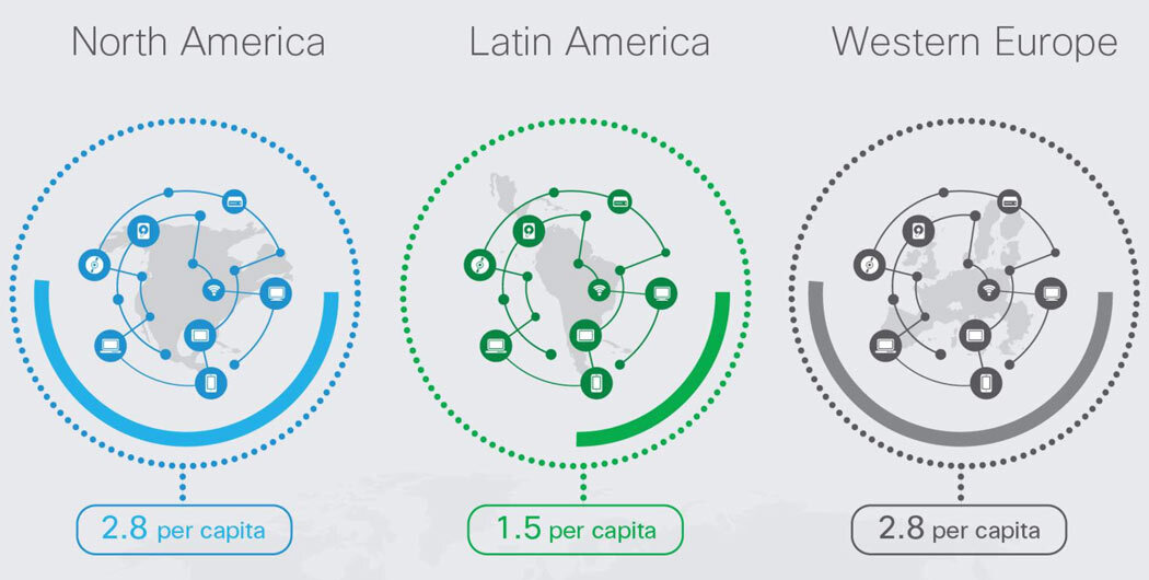 Los datos cambian cuando hablamos de regiones como Norteamérica o Europa occidental: por persona tendremos 2,8 móviles (2 en España). Con esta cifra tan elevada resulta lógico que el tráfico mundial de las personas conectadas vaya a realizarse casi de manera exclusiva mediante smartphone, con unos datos que sorprenden: en el 2021 el 80 % del contenido descargado será vídeo, tendremos velocidades medias de 27 Mbps.