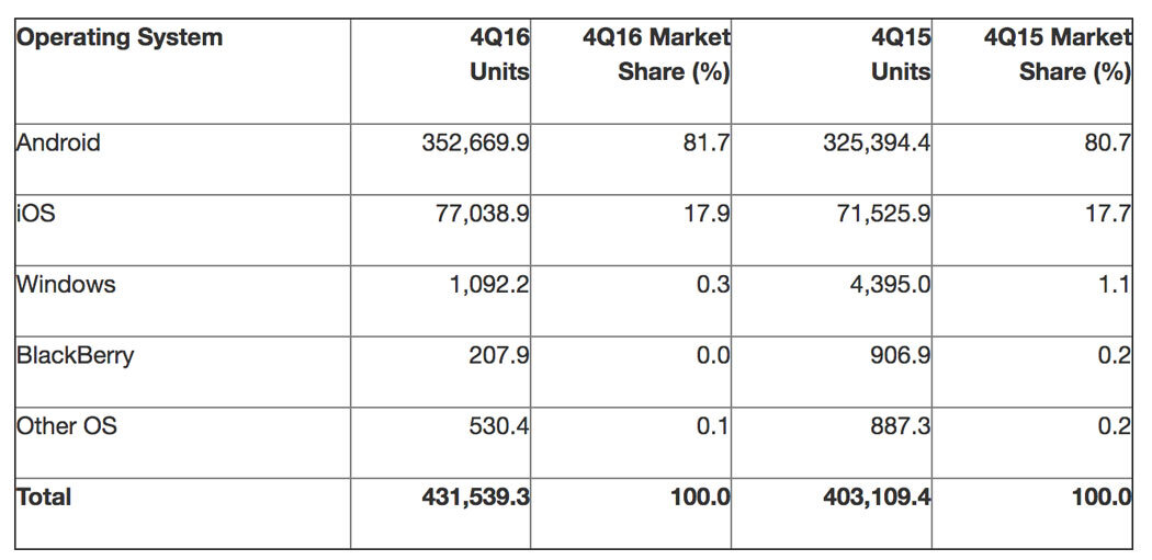 El porcentaje de ventas de Android es apabullante, como decíamos: el 81,7 % de todos los smartphones distribuidos durante el 2016. Ha sido Gartner la encargada de dar las cifras con respecto a los sistemas operativos móviles. Y no solo constata la supremacía de Android y iOS, también la estadística desaparición del sistema BlackBerry y la casi nula representación de Windows para móviles.