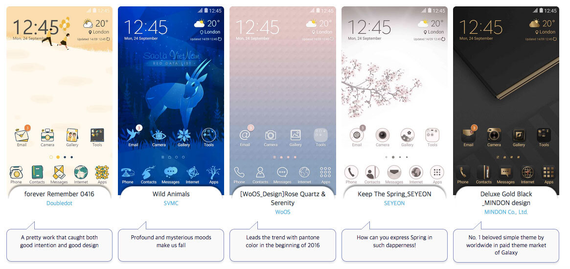 Si lo que queremos es algo más local mejor visitar los temas más importantes en cada país, lo que nos da una idea de la estética de cada uno. Por otra parte también podemos seleccionar alguno de los que los responsables de Samsung han elegido como los mejores de 2016, aunque digamos que se nota un poco la tendencia dominante en la compañía.
