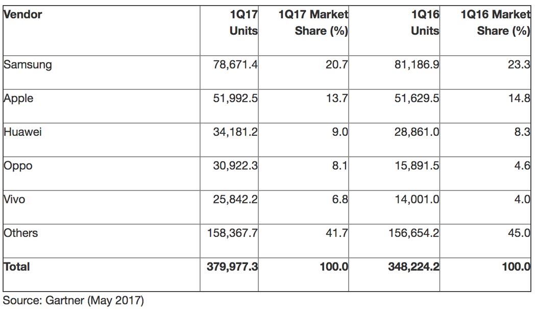 BBK Electronics, empresa que agrupa a fabricantes chinos de smartphones como VIVO, OPPO o OnePlus, consigue el segundo puesto en el primer trimestre de 2017 por móviles vendidos.