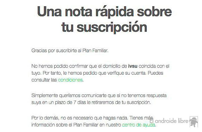 Spotify debería de enviar correos avisando de la desconexión al administrador del plan y también a las cuentas conectadas, pero no está ocurriendo en la mayoría de los casos. A mí mismo me ha pasado: esta mañana mi cuenta de Spotify se había convertido en gratuita. Yo no comparto el domicilio con el administrador.