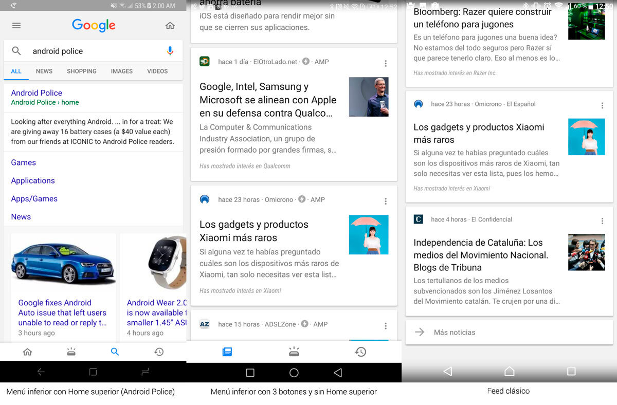Seguir estos cambios en la interfaz es sumamente complicado ya que nunca se sabe cuál será el definitivo. La búsqueda y el feed deben llevarse bien, así que apostamos por el menú inferior de cuatro botones con el icono de Home superior. Google cada vez más recargado, como Facebook.