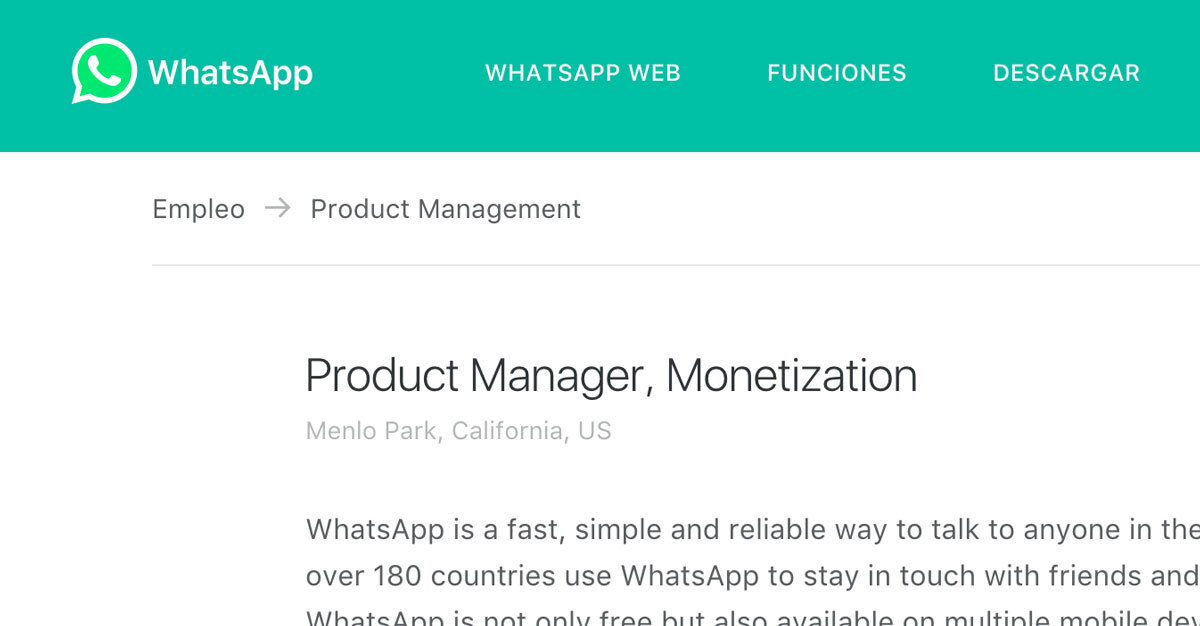 La oferta de empleo de WhatsApp anuncia que están buscando a una persona para liderar estos intentos de monetización. En sus palabras, buscan un «líder» que tenga experiencia construyendo productos, con conocimiento del mercado, para «desbloquear el potencial para servir a millones de negocios».