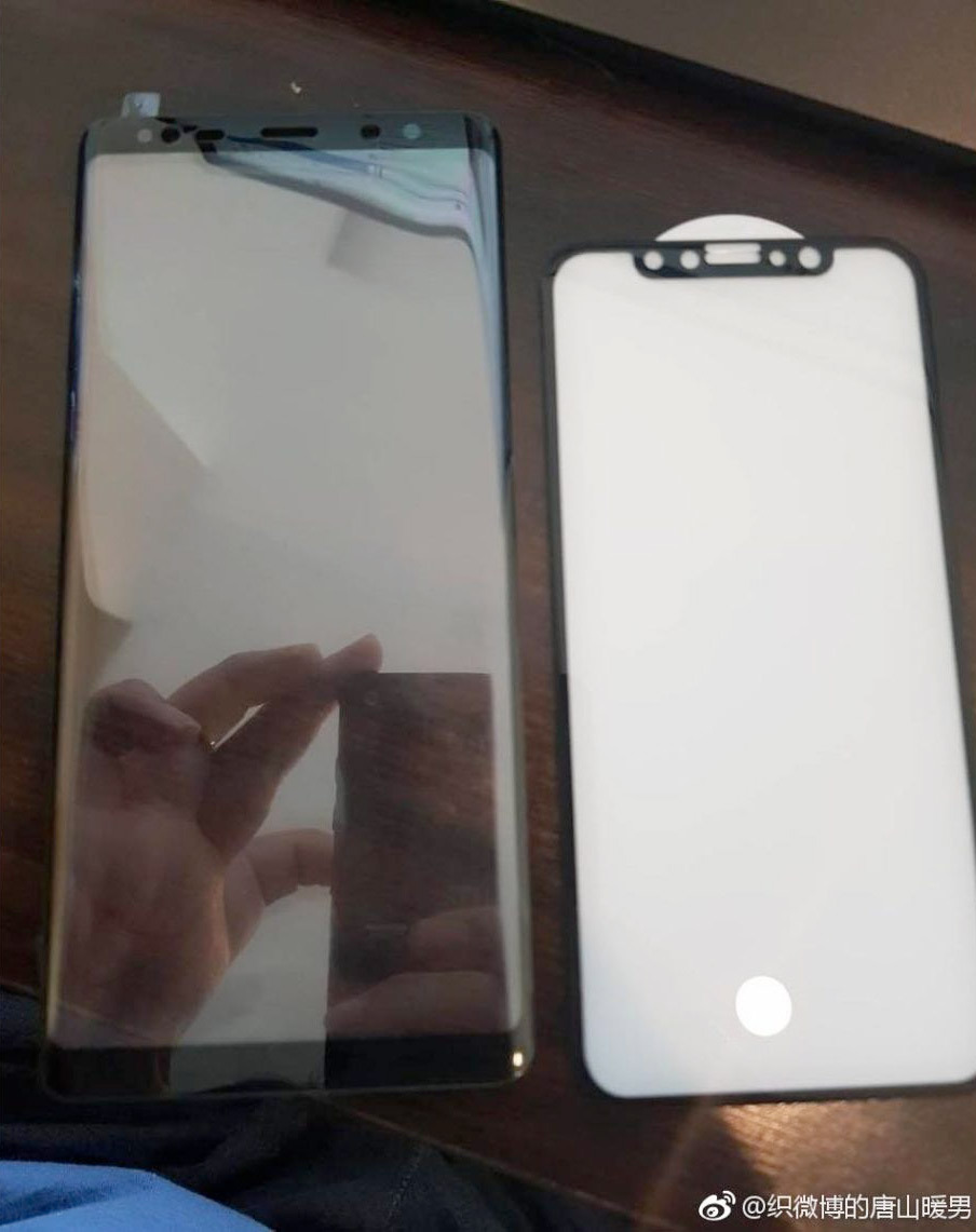 En la imagen que se ha publicado en Weibo se ven dos dispositivos que no se han presentado aún. En la izquierda vemos el nuevo terminal de Samsung, bastante más grande que el otro dispositivo que sale, o más bien que la pieza del otro dispositivo pues parece ser el panel frontal del iPhone 8.