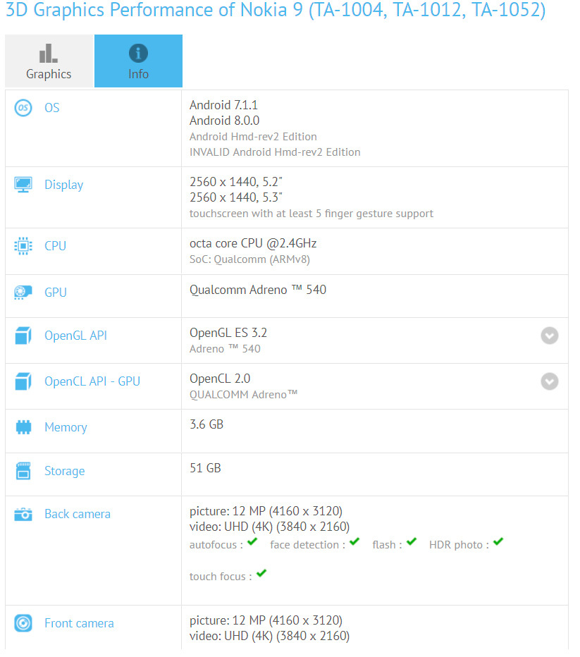 Las pantallas varían entre las 5.2 y 5.3 pulgadas aunque en todo caso la resolución es 2K. Tendrán el Snapdragon 835 con GPU Adreno 540 y 4 GB de memoria RAM. Junto a ello vemos 64GB de almacenamiento interno, ampliables por tarjeta microSD, de los cuales tendremos libres unos 51 GB. Los rumores apuntaban a que el Nokia 9 se diferenciaría de su antecesor en varios aspectos, como la memoria RAM.