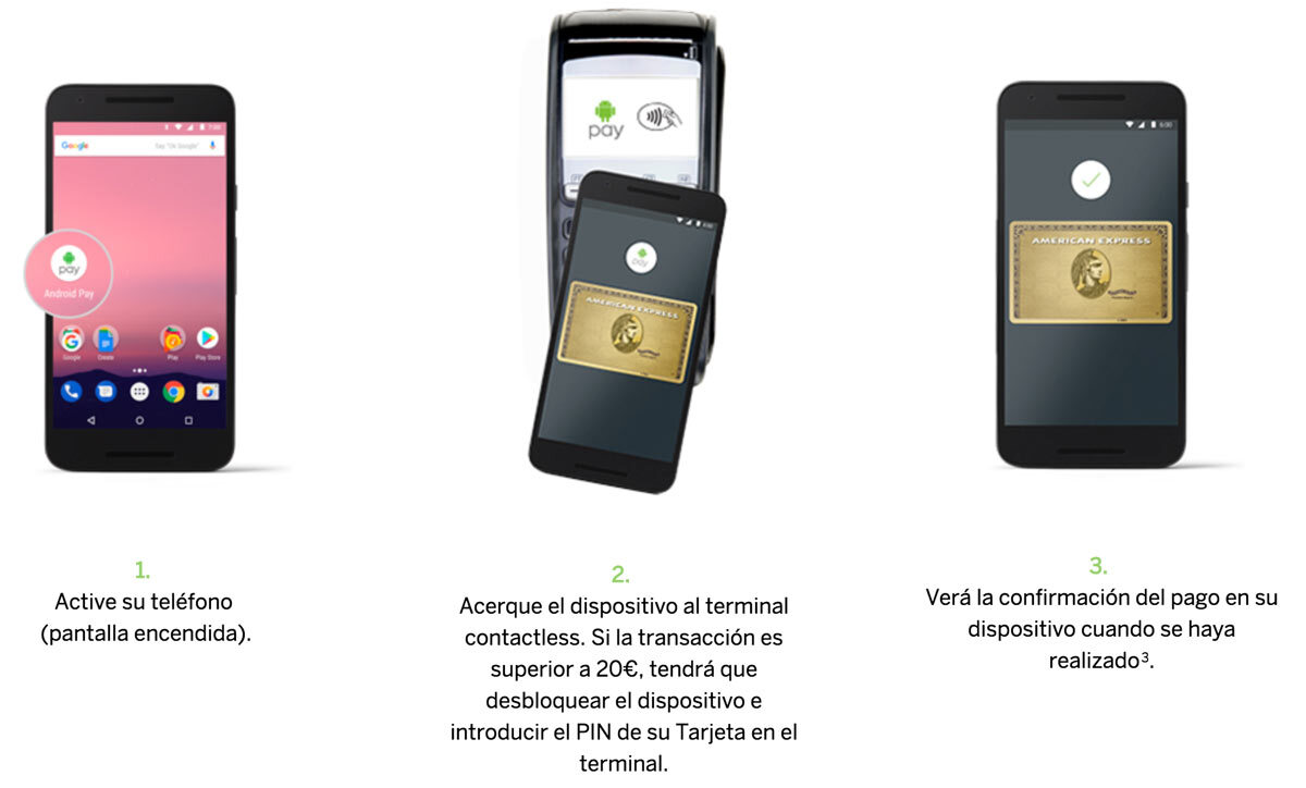 Los pagos móviles no necesitarán Pin si son inferiores a 20 euros, como es habitual en la mayor parte de pagos sin contacto. Y puedes ingresar tus tarjetas desde hoy mismo: American Express ya funciona como tarjeta compatible con Android Pay.