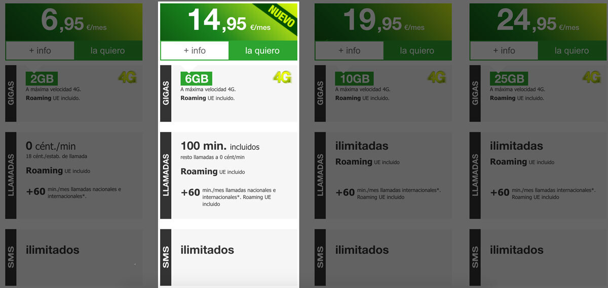 Para ser exactos, la operadora verde mejora una de sus tarifas intermedias, la que cuesta 14.95€ al mes. El precio no cambia pero la oferta sí, porque ahora esa misma tarifa cuenta con 6 GB de datos a consumir. Es un aumento de 1.5 GB respecto a la anterior tarifa del mismo precio.