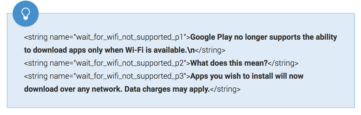 Es un cambio que no ha llamado demasiado la atención porque Google también introduce los audiolibros, pero supone un riesgo absurdo para aquellos que también utilizan su tarifa de datos para descargar aplicaciones. Según el código, la Google Play muestra un texto de ayuda que indica el fin del soporte para las descargas solo con WiFi. Así que a partir de la versión 8.4 las instalaciones grandes se descargarán con independencia de dónde estés conectado.