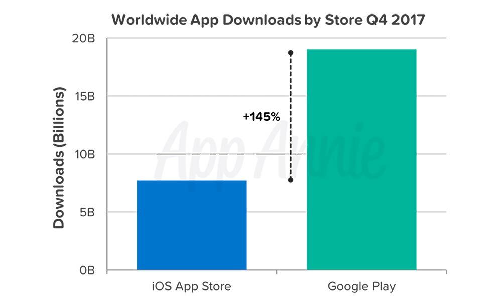 App Annie, una empresa que realiza análisis en las tiendas de apps móviles, ha presentado hoy sus últimos datos en torno al último trimestre de 2017. En ellos queda reflejado el enorme crecimiento de Android en términos de descarga: fue el trimestre que más creció de su historia. Esto no deja de ser lógico ya que hay muchos más dispositivos androides que de Apple; de ahí que las cifras en comparación sean abultadas.