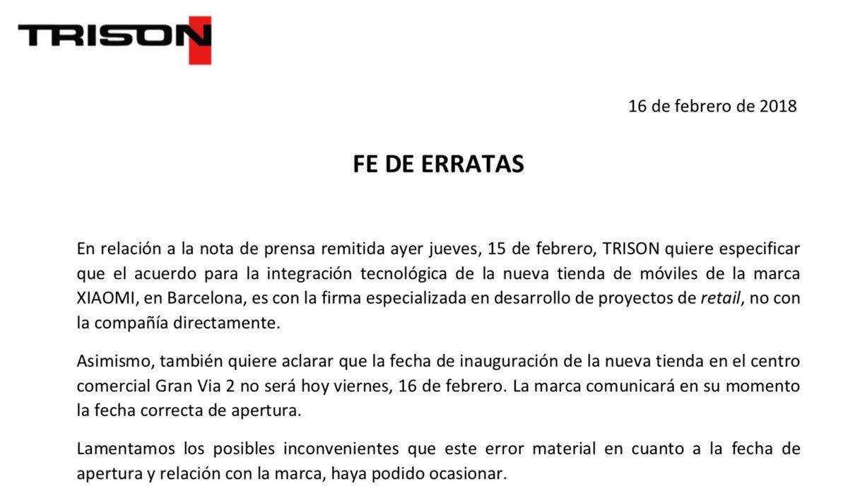 Como decíamos, Xiaomi dispone de un local en Gran Vía 2, el centro comercial que se encuentra muy cerca del MWC 2018. Dicha tienda abrirá mañana viernes según Trison, aunque esperaremos a las comunicaciones oficiales para confirmarlo. Y pronto la visitaremos, por supuesto. Trison cometió un grave error distribuyendo una fecha falsa a los medios y no consensuando la nota de prensa con la empresa para la que estaba trabajando, Xiaomi. La fecha definitiva está cercana, no sería extraño que coincidiese con el MWC 2018.