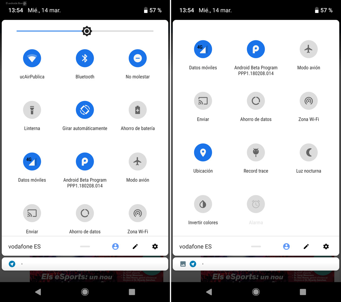 El cambio en esta nueva versión es radical, y lo vemos nada más deslizar. Los ajustes rápidos no se encuentran en una cortina, sino en una especie de «burbuja blanca». Marcados por un círculo azul nos encontramos los ajustes habilitados, y los que no tienen sobreado azul, deshabilitados.