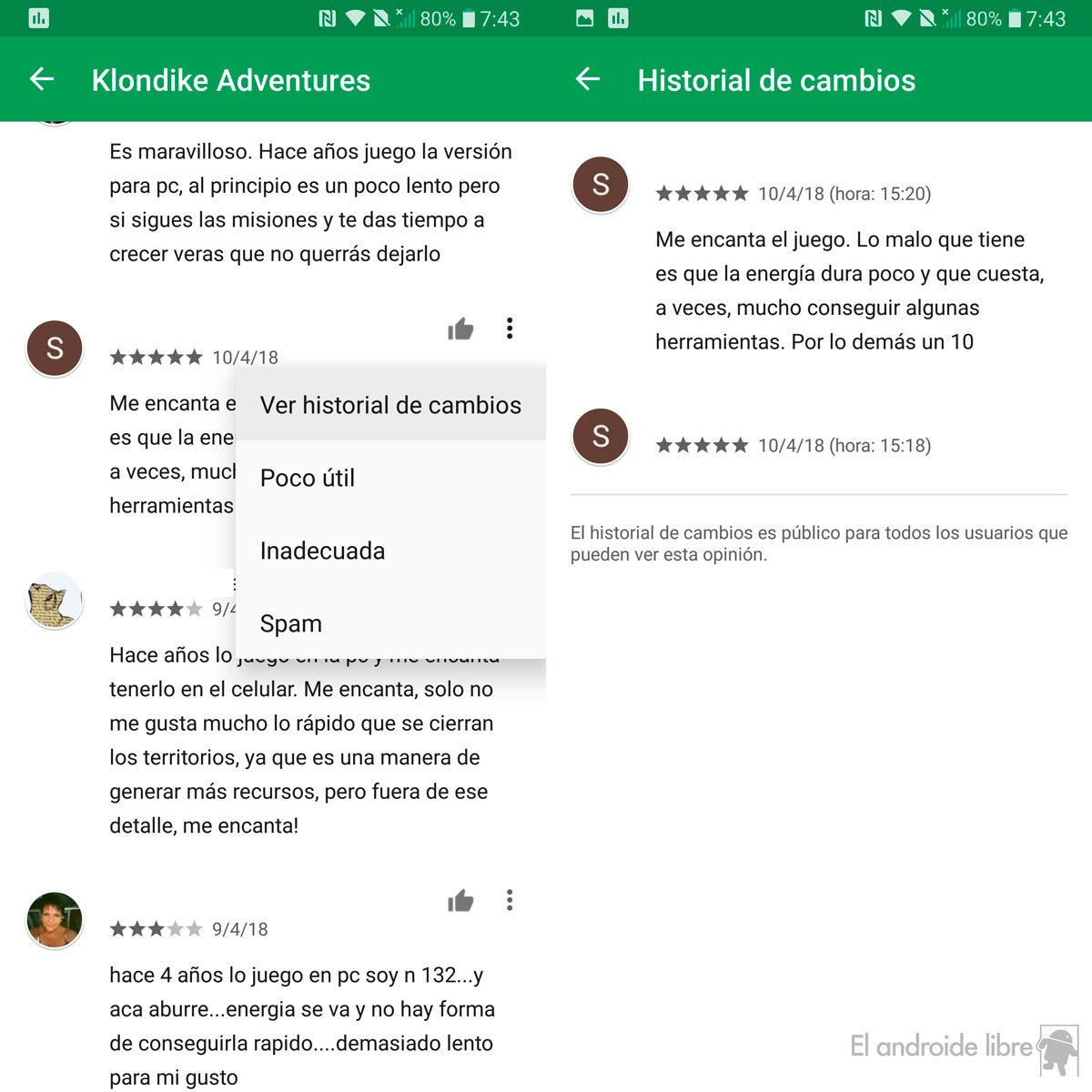 La lista de cambios ya aparece de manera pública en cada comentario de la Google Play
