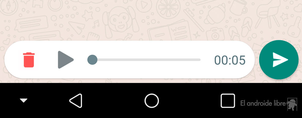 El sistema de guardado es realmente sencillo y no tendrás que hacer nada en la aplicación: si te sales de WhatsApp mientras grabas tu mensaje este quedará a punto de enviar cuando vuelvas a la app de mensajería. Con una ventaja añadida: tendrás la opción de escuchar la nota de audio para así asegurarte de que es eso lo que quieres enviar. No serás el primero que se arrepiente de un mensaje de voz, por más que ahora WhatsApp permita eliminar los mensajes para todos.