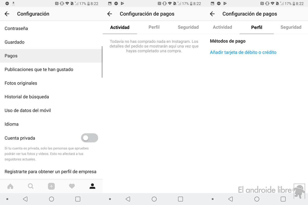 Para acceder a la introducción de los datos de tu tarjeta solo tienes que acudir a las opciones de tu perfil: si Instagram te ha incluido en el grupo de prueba allí verás la opción de «Pagos«. Basta con acceder a este menú para encontrarte con las posibilidades habituales: añadir nuevas tarjetas, especificar un pin de seguridad para las compras y también un registro de todas esas compras realizadas a través de Instagram.