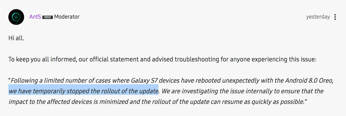 El problema detectado en los Samsung Galaxy S7 y Galaxy S7 Edge con Android 8 Oreo no atañe a todas las unidades, sí a un número notable de ellas. Para no extender el error y que los usuarios pierdan los datos por el camino, Samsung se ha decidido a detener la dosis de Oreo para los gama alta de 2016. Lo comenta un moderador en el foro europeo del fabricante.
