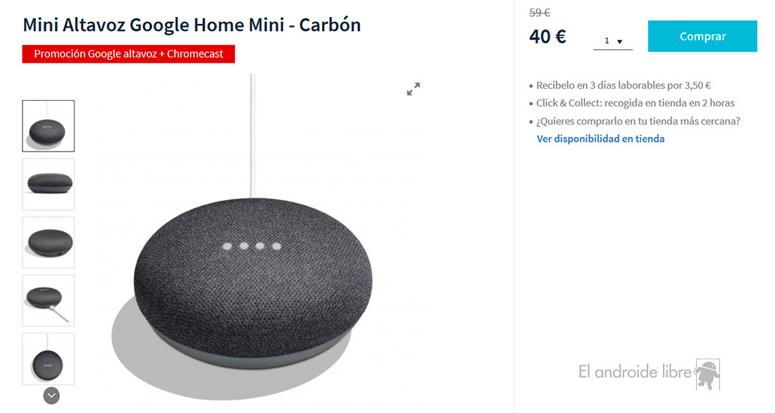 Así, podemos comprar el Google Home Mini por solo 40 euros, un 33% más barato que su precio normal de 59 euros.