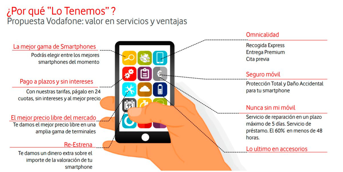 Bajo la idea «Lo Tenemos», Vodafone quiere hacer ver a los potenciales clientes que comprar un smartphone en sus tiendas o web es más conveniente que hacerlo en otro sitio. Para ello ha tomado diversas medidas.