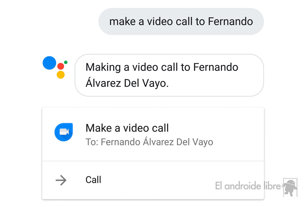 - Di «Hacer una videollamada a…» y cita el nombre que quieras de tu agenda. Como aún está en inglés puedes invocar la acción con «Make a video call to…«.