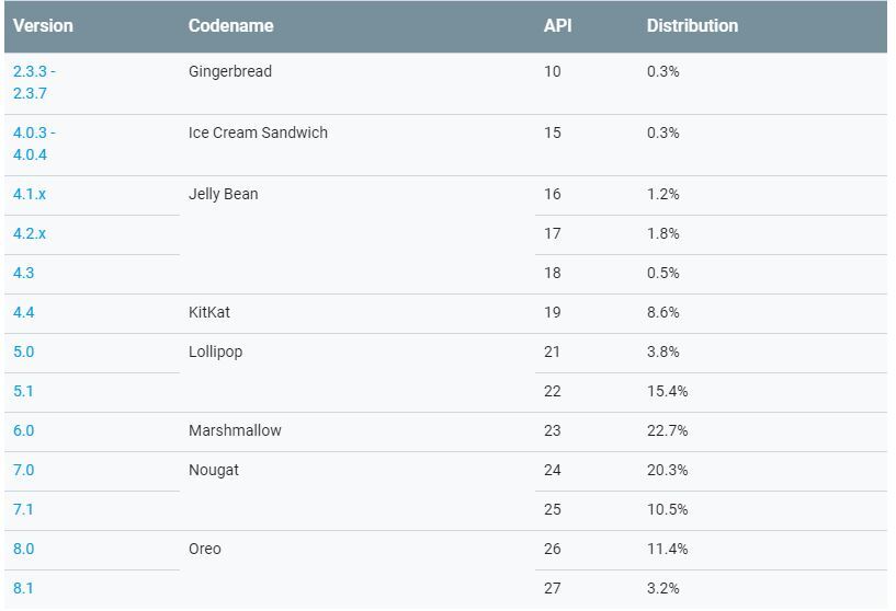 De hecho el problema no es tanto que Android 9 Pie no aparezca en los gráficos (sólo aparecen las versiones que tienen más de un 0.1% de cuota de mercado), sino que no sea Android 8, la versión del año pasado, la que domine.