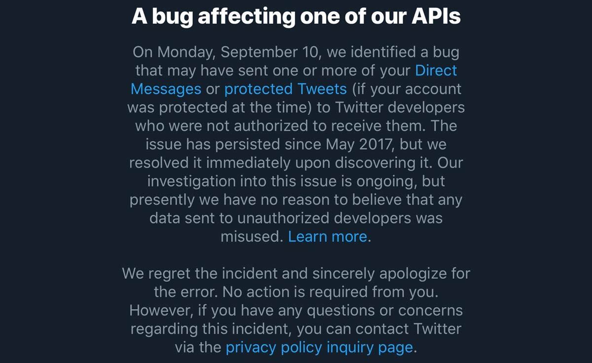 Twitter asegura que no tiene constancia de que los mensajes privados se enviasen a desarrolladores no autorizados. Aun así, está alertando a los usuarios que se vieron afectados. Si es tu caso te aparecerá una alerta según accedas a la aplicación.