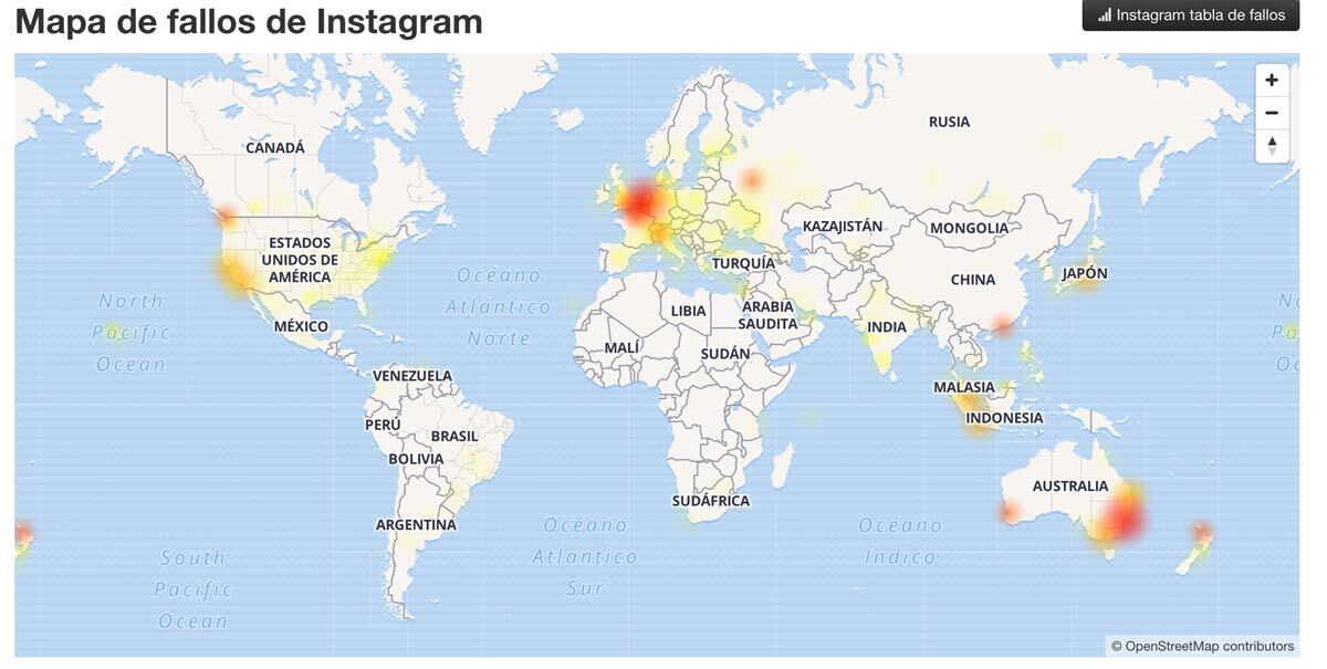 Mapa de Down Detector con la afectación de la caída de Instagram (9:30 hora española)