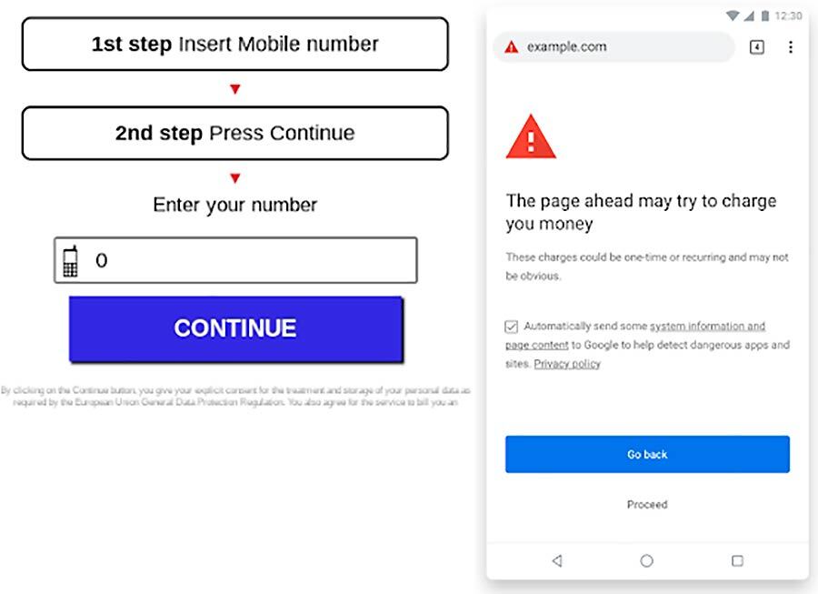 Izquierda, ejemplo de formulario con petición de número de teléfono; derecha, Chrome bloqueando la web