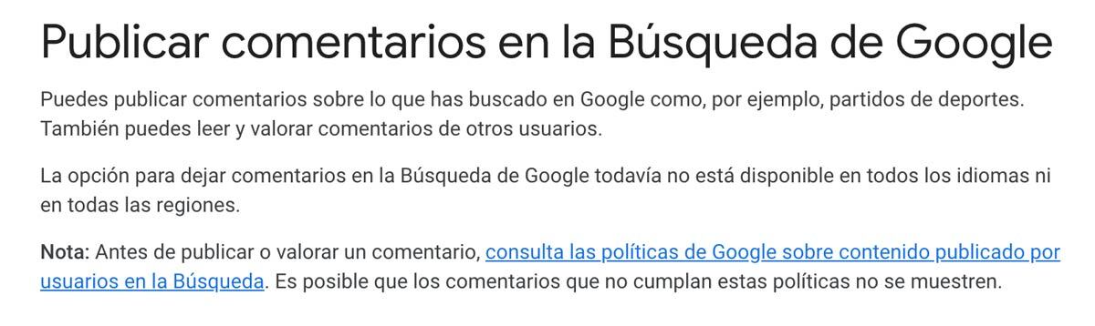 «Puedes publicar comentarios sobre lo que has buscado en Google como, por ejemplo, partidos de deportes. También puedes leer y valorar comentarios de otros usuarios».