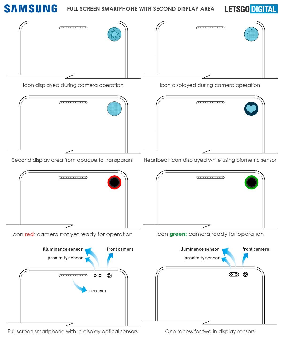 Dicha segunda pantalla sería transparente ya que no debe obstaculizar en ningún momento la captura de las imágenes. Podría oscurecerse cuando la cámara delantera no se encuentre en uso y mostrar distintos iconos según la aplicación que se esté usando en el momento. Samsung ofrece dos ejemplos: un corazón si el usuario está utilizando el lector de ritmo cardíaco; o el icono del obturador cuando se abre la app de cámara.