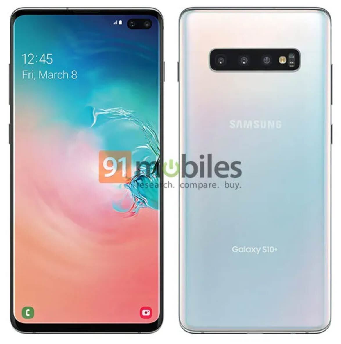 91Mobiles es el medio que trae la imagen del Samsung Galaxy S10+ en exclusiva. Aseguran que es un render oficial de prensa, algo que tiene altísimas posibilidades de ser cierto. Dicho render confirmaría los diseños rumoreados; manteniendo el aspecto de las imágenes oficiales de prensa y con la supuesta fecha en pantalla de puesta a la venta: el 8 de marzo.