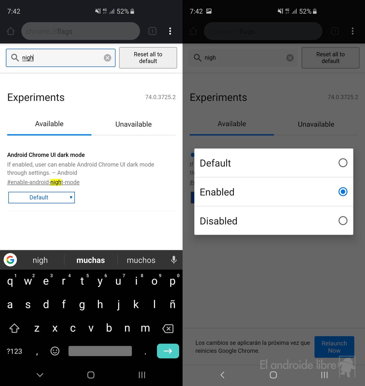 Como suele suceder en Chrome, el equipo de desarrollo ha ocultado la novedad en forma de función experimental o «flag«. Para activar el modo noche solo hace falta activar la citada función, y listo: la interfaz cambia el fondo blanco por un tono mucho más oscuro. En ningún caso es negro por completo, mala noticia para los que poseen una pantalla OLED.