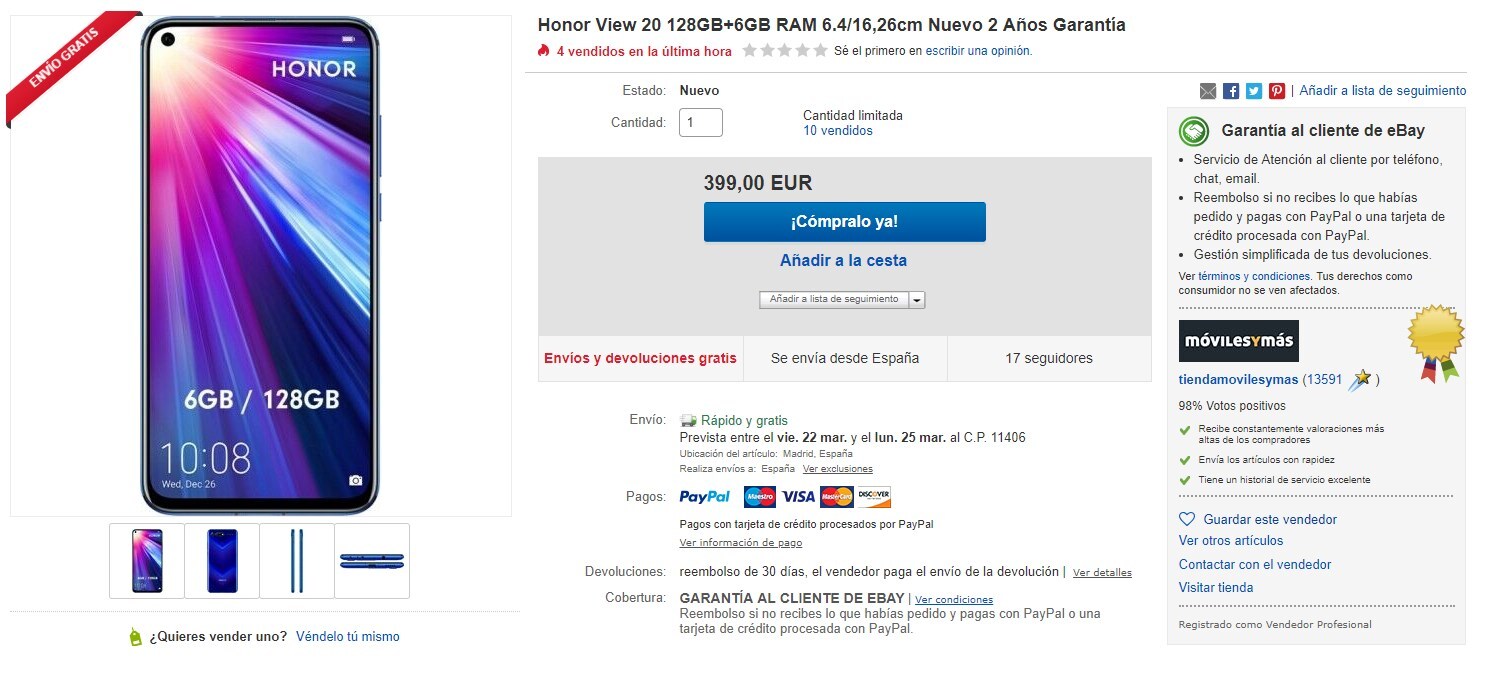La última oferta de este móvil es en eBay, lugar donde podemos hacernos también con móviles como el Galaxy S10e a un precio espectacular. El Honor View 20 se queda a un precio de 400 euros en su versión de 128 GB, superando en calidad / precio incluso al Xiaomi Mi 9.