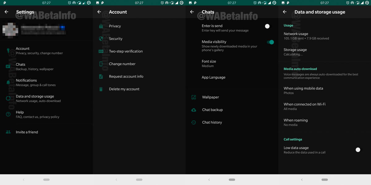 De momento WhatsApp solo adaptó la interfaz de ajustes al modo oscuro, por eso aún no está disponible: falta finalizarlo. Como demuestran las capturas, el fondo casi negro domina la configuración ofreciendo un tono algo más gris para las cabeceras de menú. En términos de opciones estas no cambian ya que la disposición de ajustes es idéntica como hasta ahora.