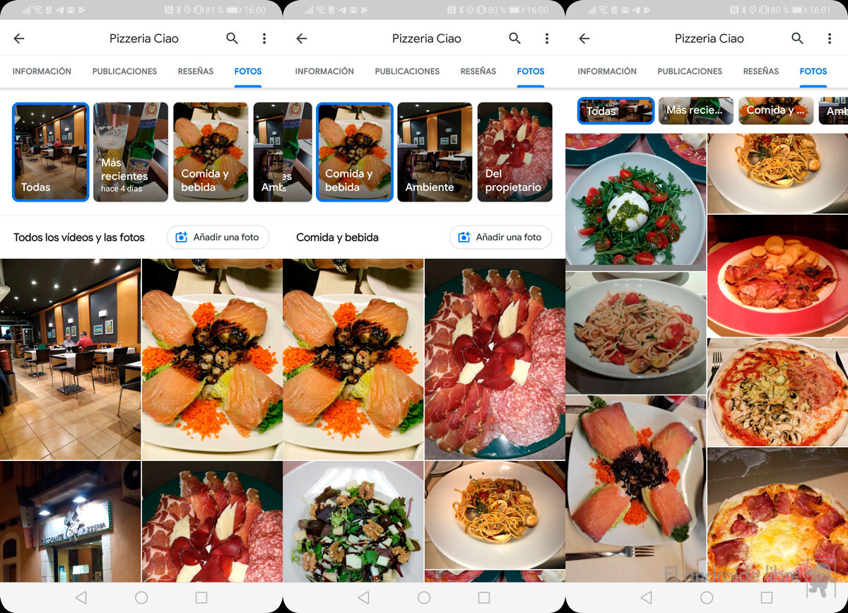 El tipo de establecimiento también condiciona las pestañas de fotos. Los restaurantes tienen una sección dedicada a la comida y bebida que sirven, por ejemplo; también una de ambiente en la que se puede apreciar el aspecto interior del local.