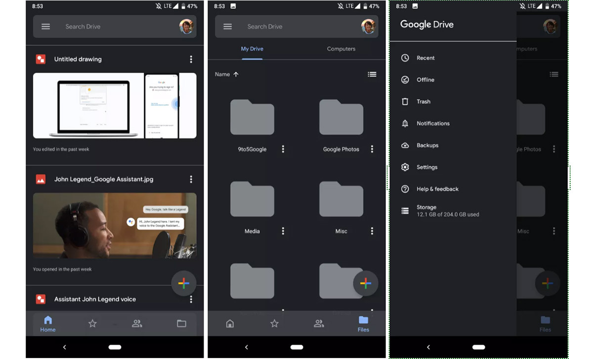 Volviendo al tema oscuro, Drive lo está activando junto con el tema Material Design. Solo unos pocos usuarios con Android 9 Pie y posterior pueden disfrutar de él: cambia el fondo blanco por un gris oscuro casi negro. Para activarlo hay que encender el modo ahorro de energía o activar el modo oscuro desde los ajustes de desarrollador, pero lo más seguro es que aún no lo tengas disponible. Nosotros sí podemos ver la pantalla de carga en negro activando el modo noche en One UI de Samsung, pero la interfaz de Google Drive continúa en blanco.