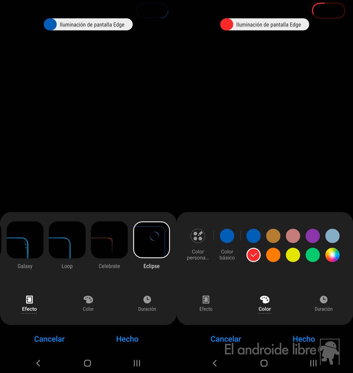La app en cuestión es EdgeLightning+: Samsung la ha actualizado para incluir un nuevo efecto, «Eclipse«. Con dicho efecto el contorno de la cámara frontal de los Samsung Galaxy S10 se iluminará conforme haya notificaciones pendientes de leer. El funcionamiento es similar al que tiene la aplicación de Chainfire, Holey Light.