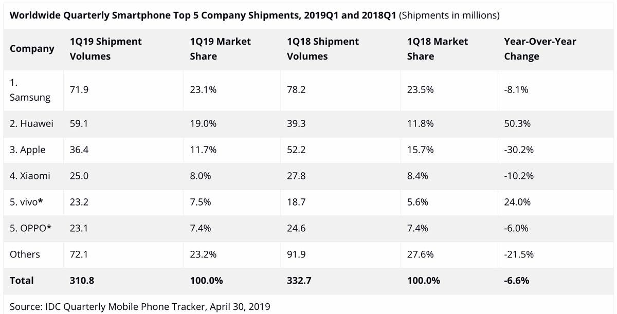 Los datos estimados que arroja IDC en relación con la distribución de smartphones mantienen a Samsung en primer lugar con Huawei en segundo, Apple en tercer puesto y Xiaomi en el cuarto. El último año, contabilizado desde el primer trimestre de 2018 al primero de 2019, ha sido especialmente convulso para Apple ya que ha perdido el 30 % de cuota de mercado. Esta pérdida en distribución ha quedado reflejada en los beneficios comunicados a los inversores: crecen wearables y servicios, baja la venta de iPhones.