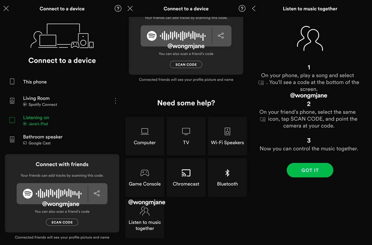 La opción de Escucha Social o Social Listening se encontraría dentro del apartado de «Dispositivos disponibles«, el menú con el que se puede seleccionar dónde va a reproducirse la música. Aparte de escucharse en el propio teléfono o en un altavoz Spotify añadirá la posibilidad de «Conectar con amigos«. Bastará con escanear el código desde otro móvil para que las apps se sincronicen; permitiendo a los usuarios disfrutar de la música en sincronía y con el control de la reproducción.