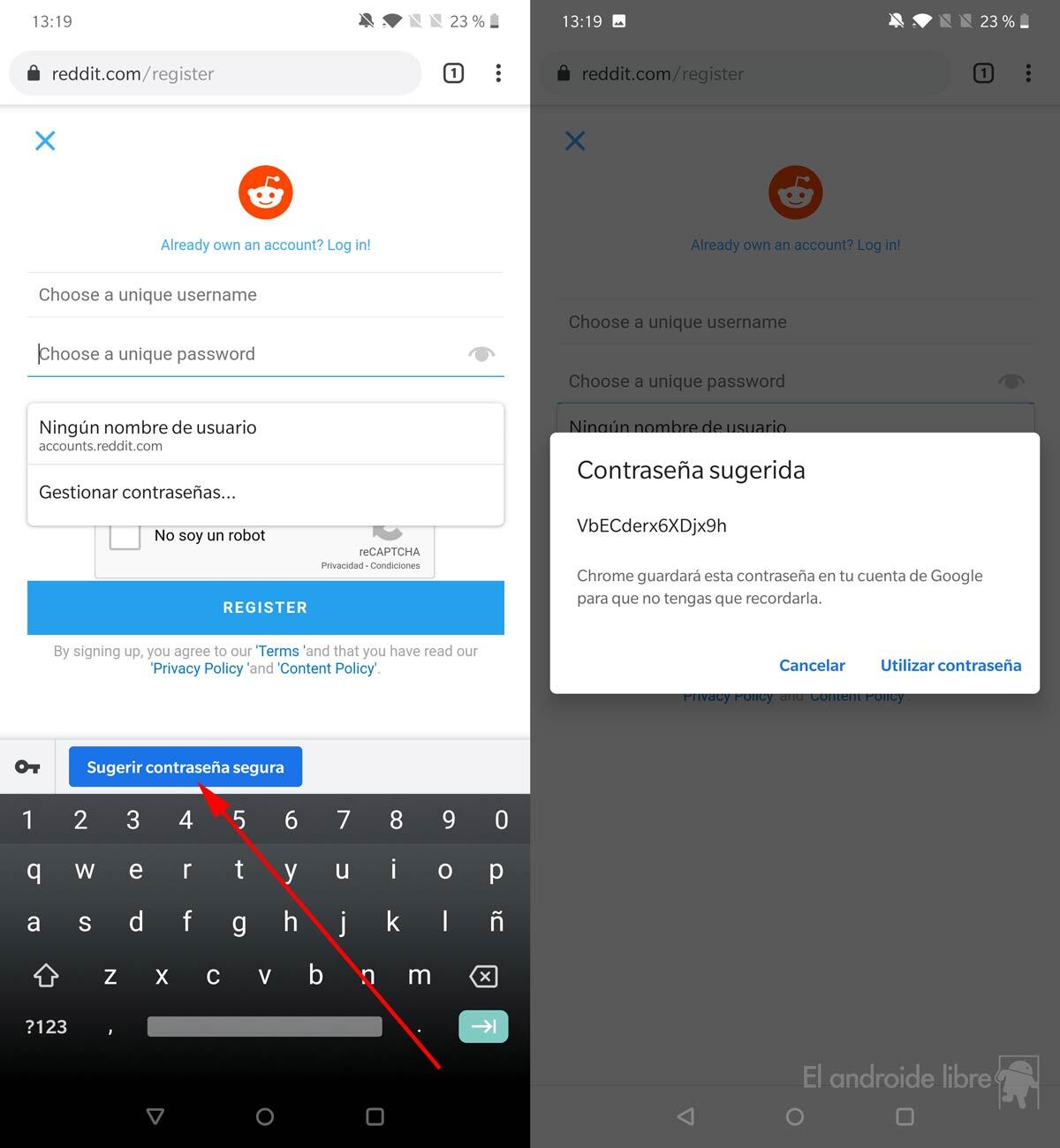 No tienes que hacer nada: si dispones de Google Chrome 75 automáticamente te sugerirá contraseñas seguras cuando te encuentres en cualquier registro web. Para ello utiliza un generador aleatorio de passwords que se encuentra accesible en el botón de «Sugerir contraseña segura«. Dicho botón salta siempre que se reúnan las condiciones: que sea un registro nuevo y que la web cumpla con las condiciones de seguridad y de privacidad.