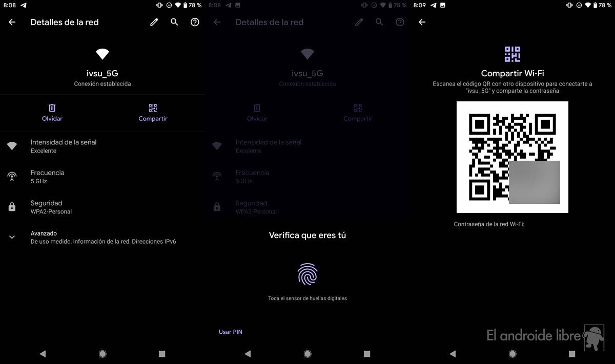 ¿Cómo funciona el citado WiFi Easy Connect? Desde los ajustes de la WiFi se puede compartir cualquier red registrada en el teléfono con ayuda de un código QR: basta con autentificar la acción con el PIN del móvil o la huella dactilar registrada y listo. Después, el móvil que va a conectarse solo debe capturar el código y estará registrado en segundos dentro de la red. Esto es válido para Android y también para otros dispositivos, como los routers: muchos traen de serie el código QR impreso en la base.