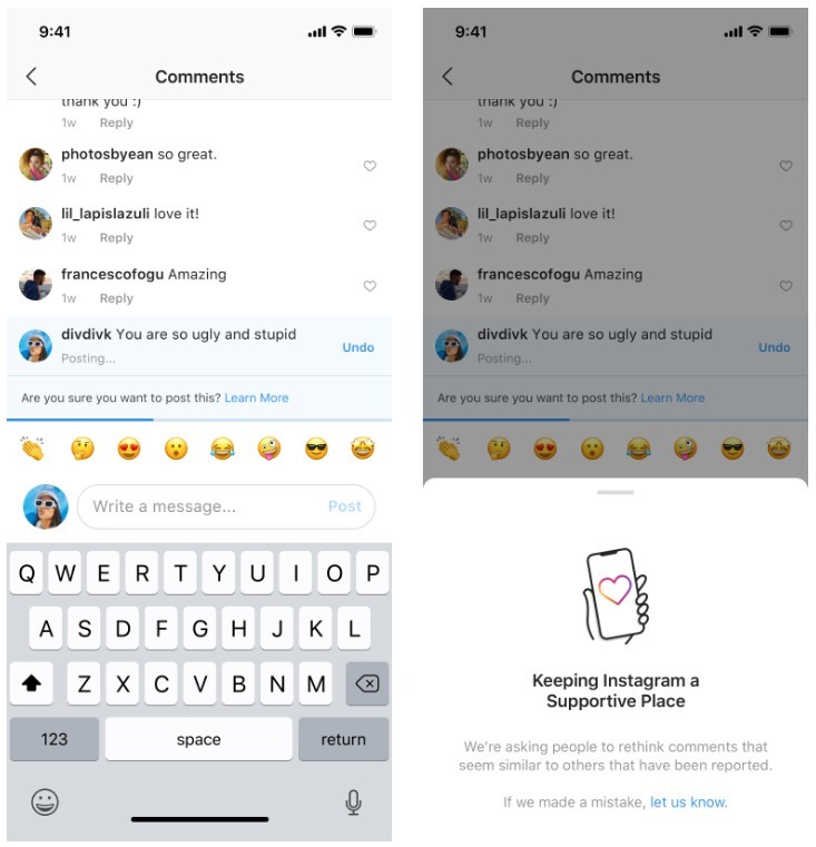La primera de ellas es una herramienta de concienciación que funciona a través de inteligencia artificial. Esta herramienta es capaz de detectar que tu mensaje podría ser ofensivo, y te da la oportunidad de retractarte de tus palabras y deshacer tu comentario ofensivo. Una herramienta que pretende suplir a la vocecilla que a veces nos dice que igual ese mensaje no es el adecuado.