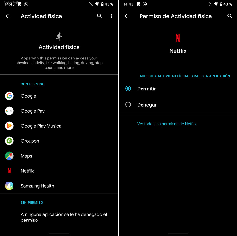La alarma saltó cuando @BetoOnSecurity publicó en Twitter una imagen en la que descubría que la aplicación de Netflix solicitaba permiso para acceder a los datos de actividad física. Este permiso se puede gestionar en Android Q, permitiéndonos ver las aplicaciones que hacen uso de ella.