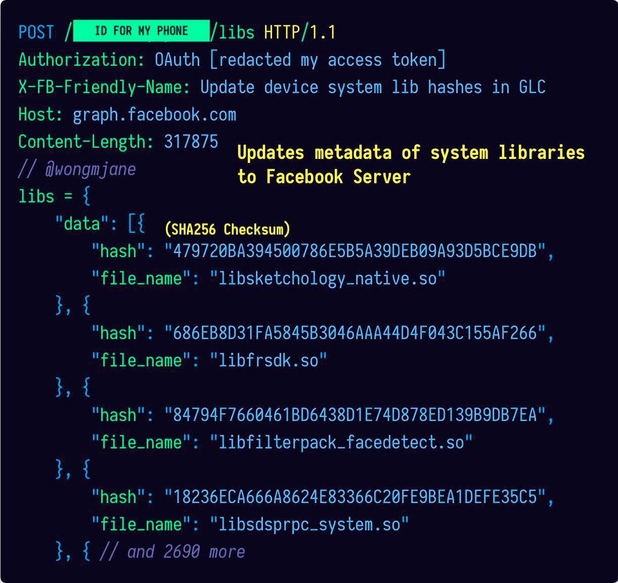 Paquete interceptado subiendo los metadatos de las librerías a Facebook. Imagen de Jane Manchun