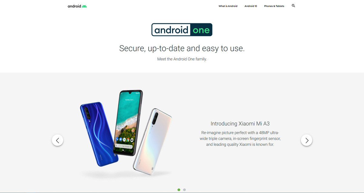 Dentro de su web disponemos de las principales características de usar un dispositivo basado en Android One. Enseñándonos de manera destacada los smartphones más recientes que usan Android One, actualmente el Xiaomi Mi A3 y el Nokia 9 Pureview.